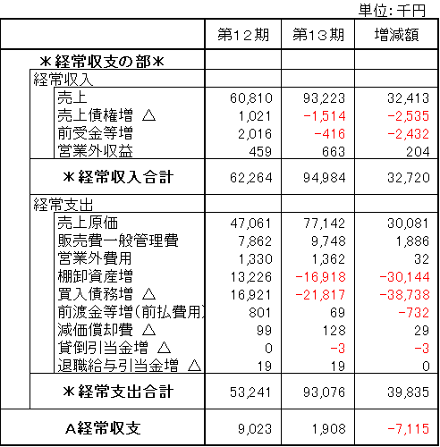 比較貸借対照表には各項目の増減額が記載されています。 これを資金移動表の「経常収支の部」に転記して計算します。